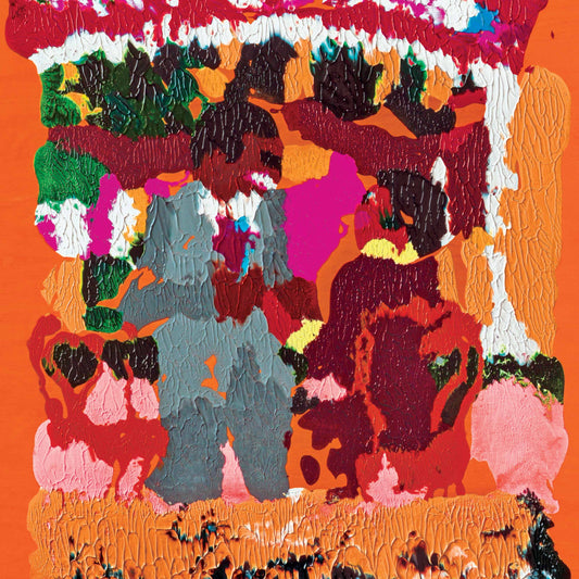 The artwork blends shapes of solid color with other collaged elements. This orange color depicts the prison outfit.